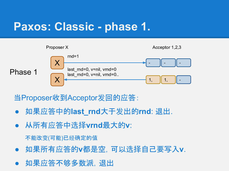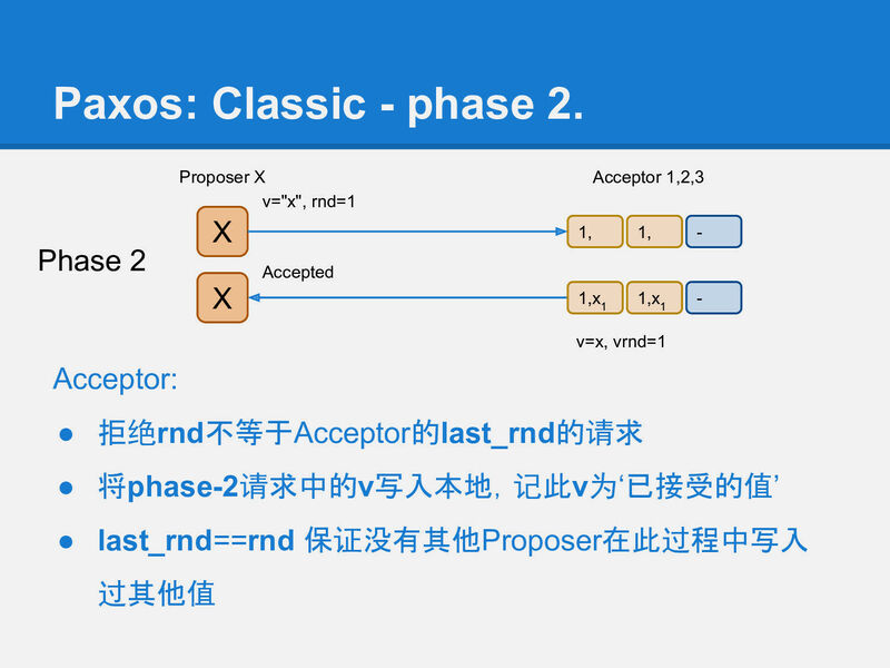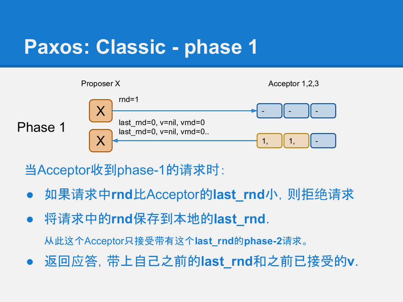 当然这时(在X收到phase-1应答, 到发送phase-2请求的这段时间), 可能已经有其他Proposer又完成了一个rnd更大的phase-1, 所以这时X不一定能成功运行完phase-2.