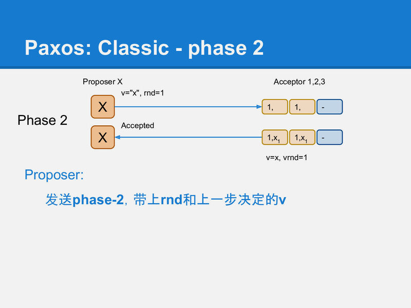 在第2阶段phase-2, Proposer X将它选定的值写入到Acceptor中, 这个值可能是它自己要写入的值, 或者是它从某个Acceptor上读到的v(修复).